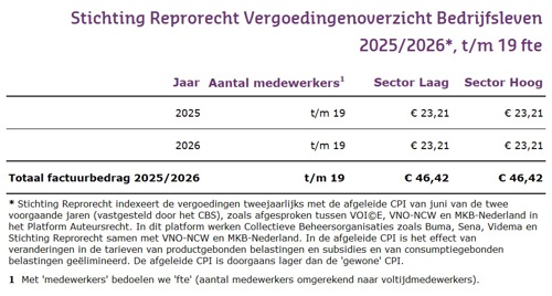 Op verzoek van VNO-NCW en MKB-Nederland belasten wij uw administratie zo min mogelijk. Daarom factureren wij bedrijven t/m 19 fte een keer per twee jaar. Hieronder vindt u de vergoeding per jaar en het totale factuurbedrag voor twee jaar.